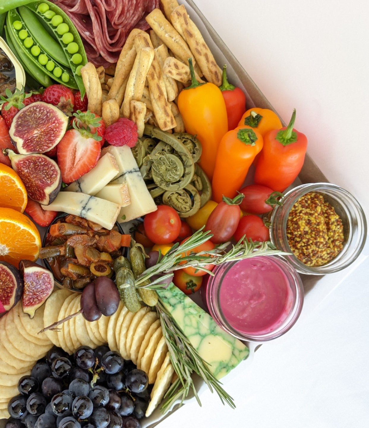 The box is filled with a fine selection of charcuterie, cheeses, preserves, dips, honey, crudités, seasonal fruits, crackers, dried fruit, pickles, olives and a sweet treat- all thoughtfully curated to give you an exciting ride in every bite.